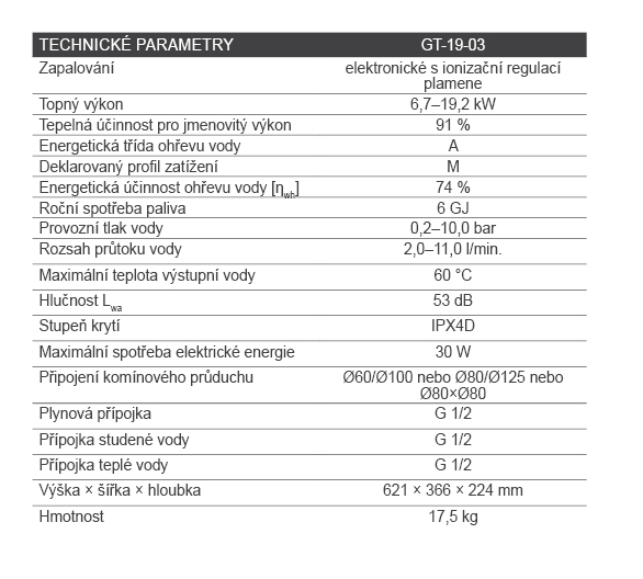 • vysoký výkon – až 24 kW – zajišťuje vysoký průtok vody až 14 dm3/min. verze GT-24-03)