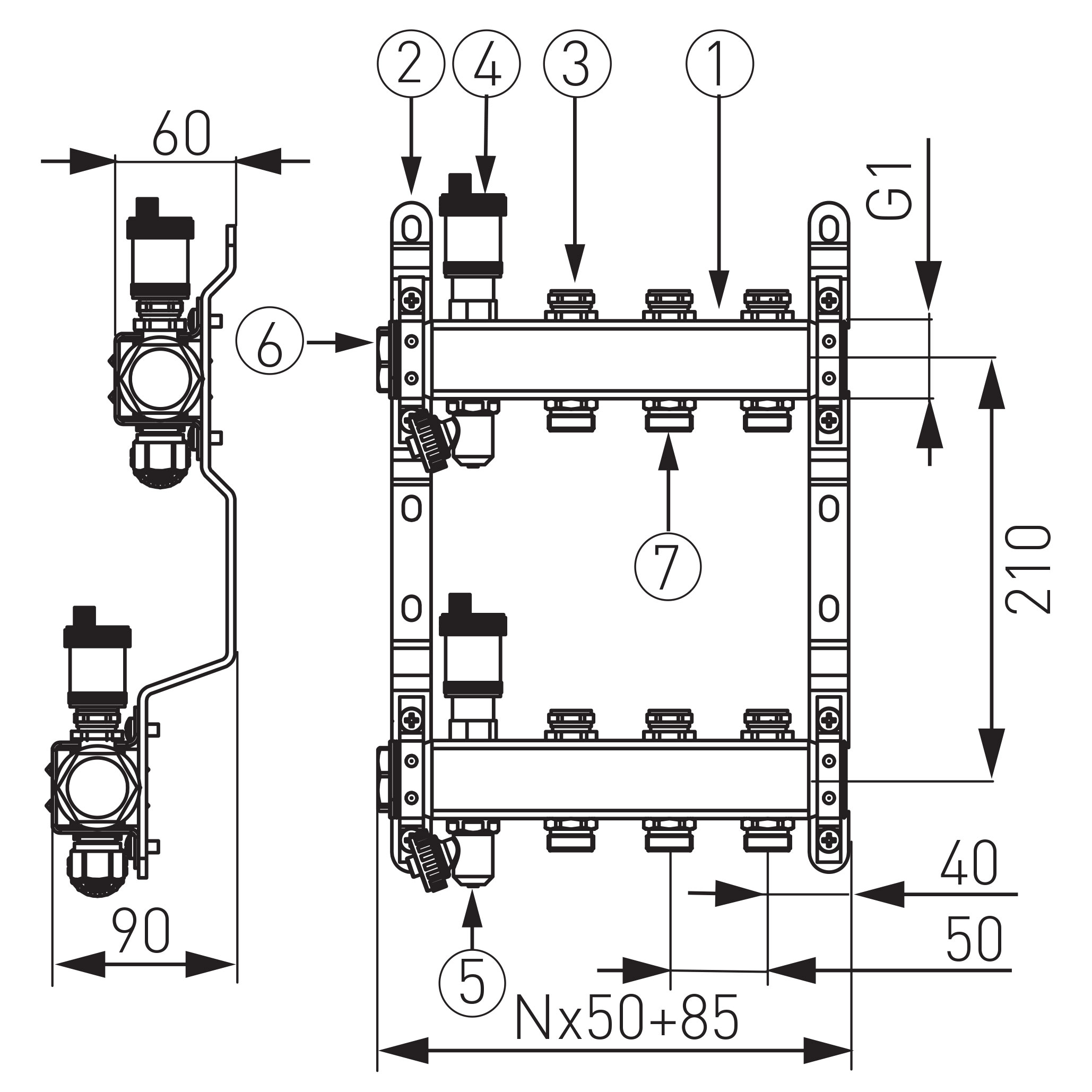 Rozdělovač s regulačními ventily pro přímé napojení otopných těles, připojení G1", výstup pro svěrné šroubení G3/4" s eurokonusem.
