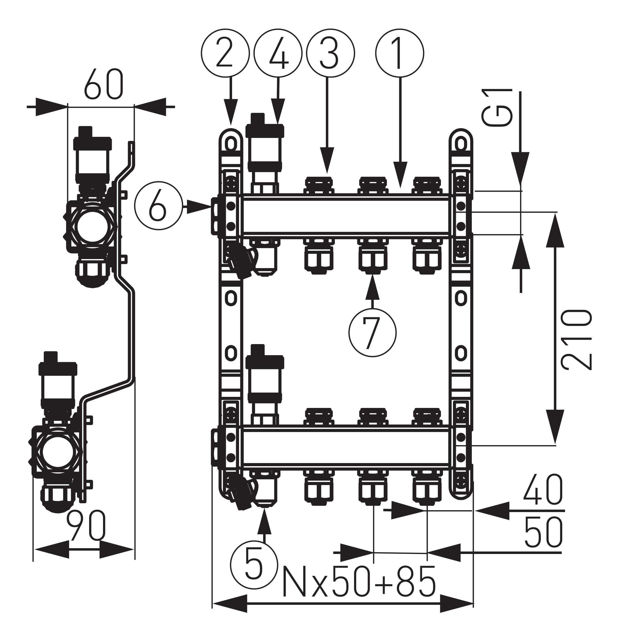 Rozdělovač s regulačními ventily pro přímé napojení otopných těles, připojení G1", výstup se svěrným šroubením AL-PEX G1/2", které je součástí balení.