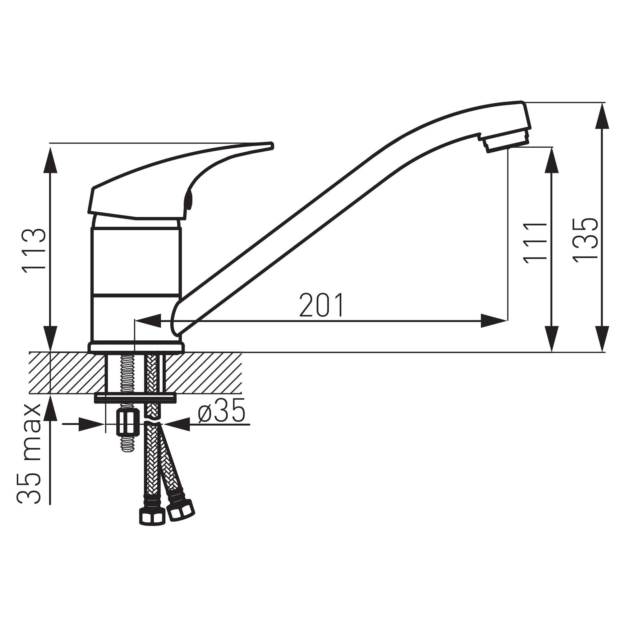 Prvotřídní, odolná kartuše 40mm s prodlouženou zárukou 5 let. Kvalitní chromové provedení. Stojánková dřezová baterie s otočným ramenem a délkou 201 mm. Součástí baterie jsou přívodní hadičky.
